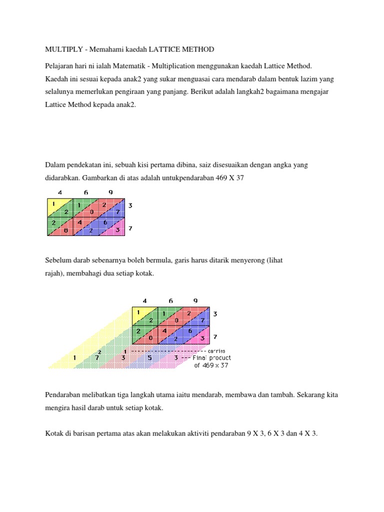 Pendaraban Alternatif Guna Kaedah Lattice. Kaedah lattice merupakan satu teknik yang menggunakan petak-petak atau kekisi untuk mendarab.