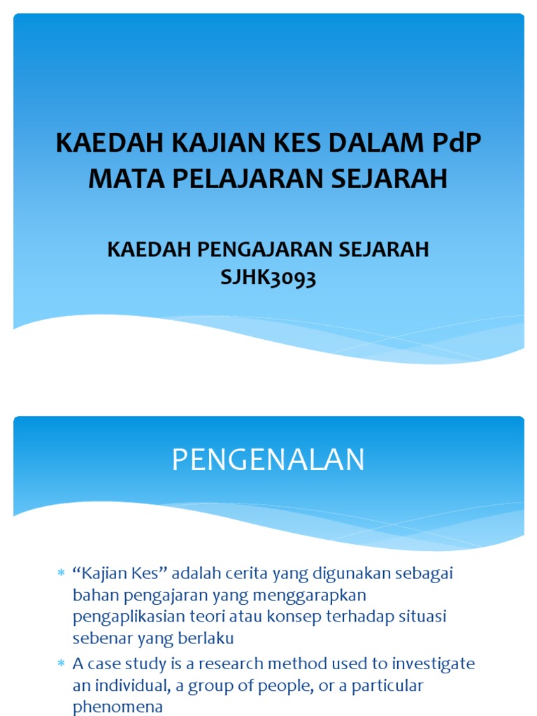 Kajian kes adalah kaedah penyelidikan yang bergantung pada satu kes dan bukannya populasi atau sampel. Kajian kes juga berguna pada peringkat awal penyelidikan apabila. Mendapat pengalaman bermanfaat semasa menjalankan kemahiran kepada murid tentang pengetahuan sejarah diri negara dan bangsa.