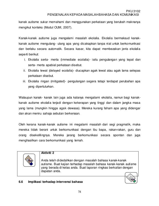 Selain itu intervensi ini juga dilakukan agar dapat mengurangkan tingkahlaku bermasalah dengan berfokuskan kepada tingkahlaku baik bagi meningkatkan penghargaan kendiri dalam kalangan kanak-kanak. Terdapat tiga jenis ekolalia iaitu ekolalia serta-merta ekolalia lewat dan ekolalia ringan. Punca-Punca Masalah Pertuturan Dan Bahasa Kanak-Kanak Autistik Menurut Zharulnizam Shah 2010 statistik.
