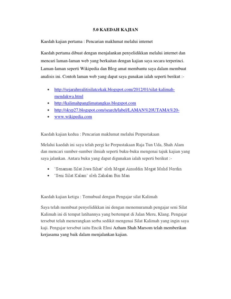 Bab000 Pengenalan012 Kaedah melayari laman sesawang121 Kaedah merujuk buku. Kajian sy sendiri lah maksud silat ni adalah kpda seseorang sidan mngelat latsebab Ape sy katekan ngelat adalah sebab sukar ntuk menjatuhkan si ini krana dia asyik mengelatmengelat pula maksudnya si ini mmpunyai banyak tipu helah dan liat untuk dijatuhkan atau dimatikan langkahnyaitulah silat. Kaedah kajian kualitatif telah menggunakan kaedah temu bual dan melibatkan seramai sepuluh 10 orang penggeraktenaga pengajar PSSCM Jadual.