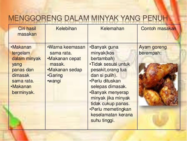 Menggunakan minyak yang banyak. A Menggoreng b Mengukus 2 Kaedah memasak dalam minyak yang banyak dinamakan a Menggoreng tanpa minyak b Menggoreng minyak penuh 3 Kaedah memasak menggunakan wap ialah kaedah a Mengukus b Merebus 4 Menumis ialah kaedah memasak dengan minyak yang sedikit di atas api perlahan. Kekurangan memasak ikan dengan kaedah menggoreng adalah.