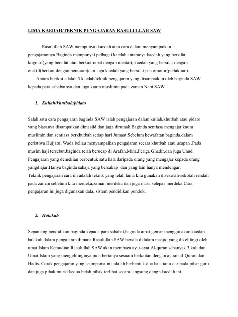 1 Murid dapat mengetahui kisah kehidupan Nabi Muhammad SAW di zaman kanak- kanak. Kertas kerja ini bertujuan mengenal pasti pedagogi yang digunakan Rasulullah s. Menurut al-Kailani 1986 terdapat lima kaedah mengajar al-Quran yang boleh dijadikan panduan kepada.