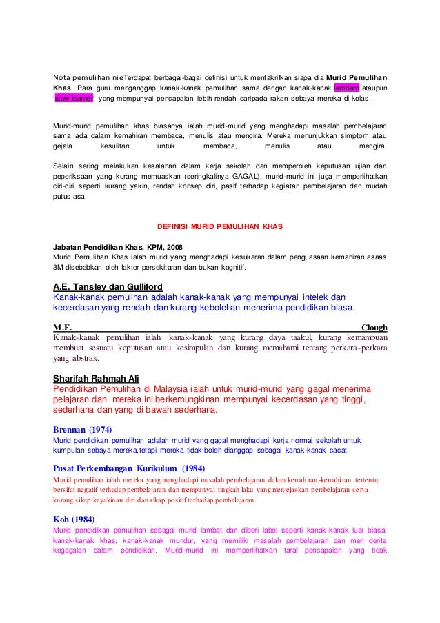 Murid Pemulihan Khas ialah murid yang menghadapi kesukaran dalam penguasaan kemahiran asaas 3M disebabkan oleh faktor persekitaran dan bukan kognitif. Jenis yang kedua adalah mendengar secara pasif. Mengajar Menggunakan Kaedah KGBK Murid Pemulihan Khas di Sekolah Menengah.
